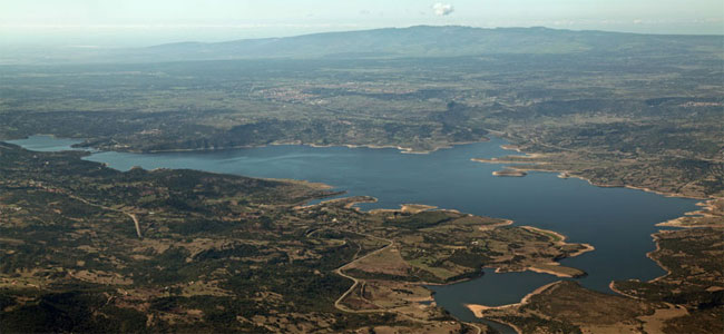 Per poter costruire l'invaso, è stato sacrificato l'antico paese di Zuri, ricostruito poi a monte con il materiale originario, compresa l'antica chiesa romanica dedicata a San Pietro risalente al 1291, che venne come smontata e riedificata pezzo per pezzo tra il 1922 ed il 1923, in modo tale da non lasciare ad alcuno la possibilità di accorgersene. A poca distanza da Zuri il lago sommerse la foresta tropicale fossile miocenica antica circa 20 milioni di anni. La superficie d'acqua è lunga oltre 22 chilometri e larga più di 3, e si estende tra i monti del Barigadu, andando poi a confluire, all'altezza di Fordongianus, nelle acque del Flumini Mannu.